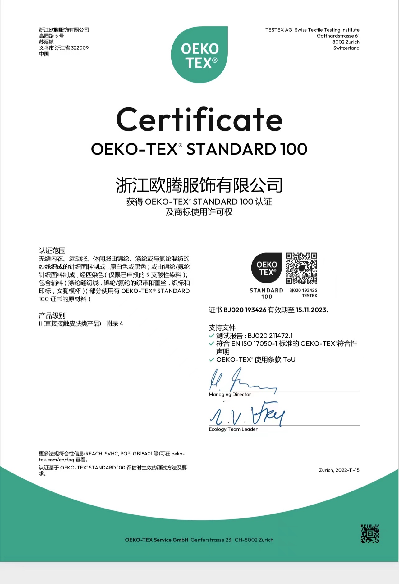 浙江歐騰服飾有限公司位于世界小商品之都-義烏。創立于2015年,是一家專業生產無縫針織運動服飾和內衣的工貿一體企業,擁有自主出口權。 工廠的占地面積約16000平方米 ,引進了大型圣東尼、高騰等多種先進的制衣設備300余臺。月產能可達90萬件。 歐騰服飾每年投入近百萬資金打樣開發新產品,有著一支高素質設計、技術員工隊伍。工廠先后通過了ISO 9001質量管理體系認證、BSCI認證、GRS認證、OEKO-TEX國際生態紡織品認證等多項專利檢測報告。可提供OEM&ODM服務。歐騰服飾以一套完整、科學的質量管理體系,生產的服裝從原材料紗線到成衣,質量完全能夠滿足國內、國際質量要求。獲得了客戶一致好評。工廠先后獲得省科技型企業、國家高新企業、義烏市誠信講信用單位、規上企業、信用AAA級等榮譽。
